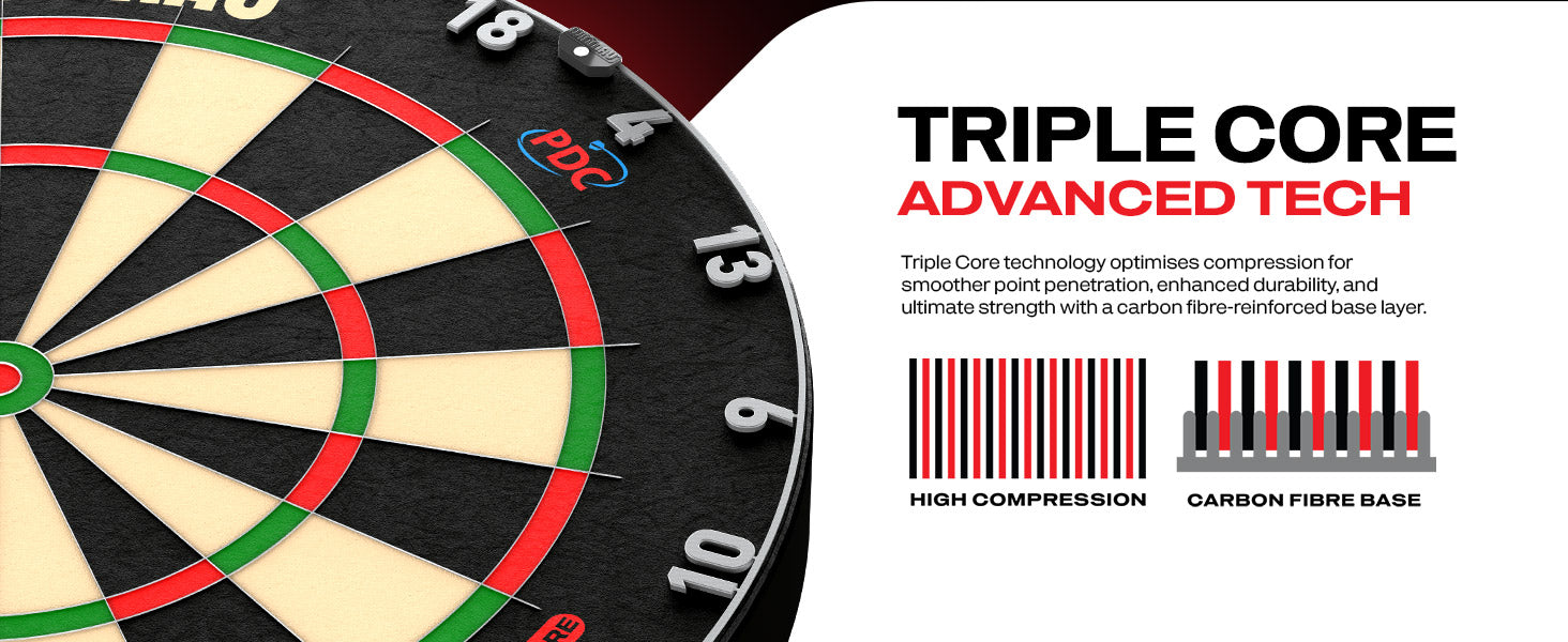 The Blade 6 Triple Core dartboard is the most technically advanced dartboard available and is the culmination of 30 years engineering innovation. The revolutionary Triple Core sisal base (Patent Number 2507762) complements Sixth Generation Blade technology, offering the ultimate combination for optimal fibre density and maximum scoring.
