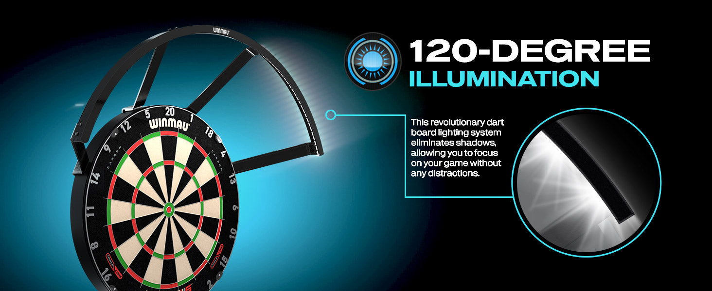 The ultimate 120° dartboard light with the simplest of fitting installations with universal dartboard fitting with or without a surround.