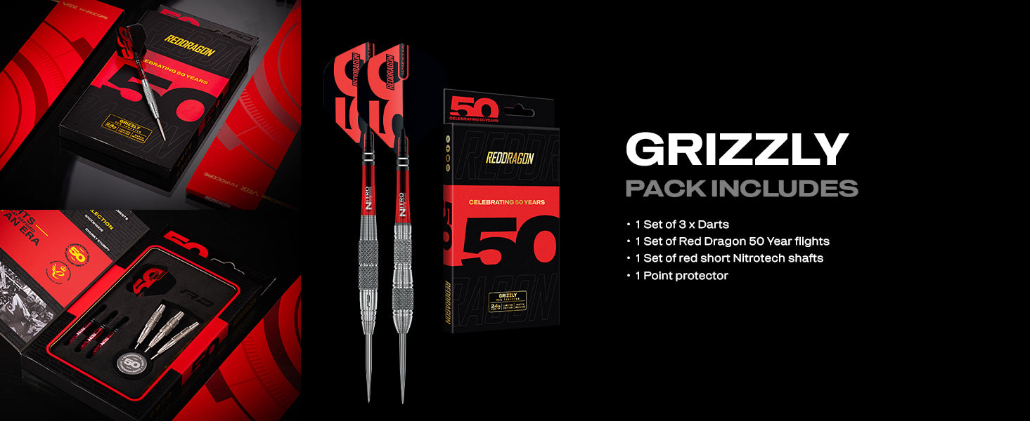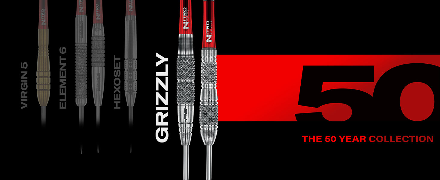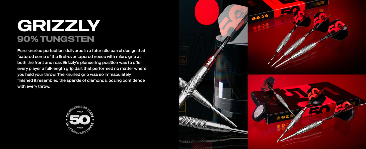 Pure knurled perfection, delivered in a futuristic barrel design that featured some of the first-ever tapered noses with micro grip at both the front and rear, Grizzly's pioneering position was to offer every player a full-length grip dart that performed no matter where you held your throw. The knurled grip was so immaculately finished it resembled the sparkle of diamonds, oozing confidence with every throw.