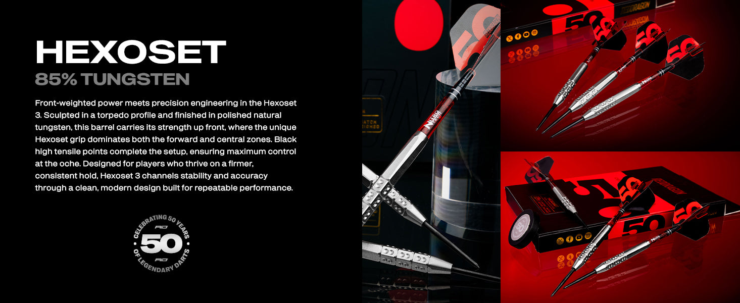 Front-weighted power meets precision engineering in the Hexoset 3. Sculpted in a torpedo profile and finished in polished natural tungsten, this barrel carries its strength up front, where the unique Hexoset grip dominates both the forward and central zones. Black high tensile points complete the setup, ensuring maximum control at the oche. Designed for players who thrive on a firmer, consistent hold, Hexoset 3 channels stability and accuracy through a clean, modern design built for repeatable performance.