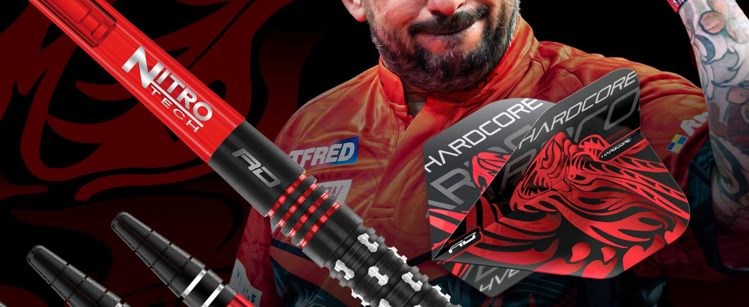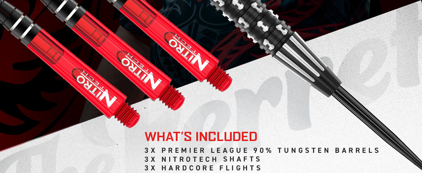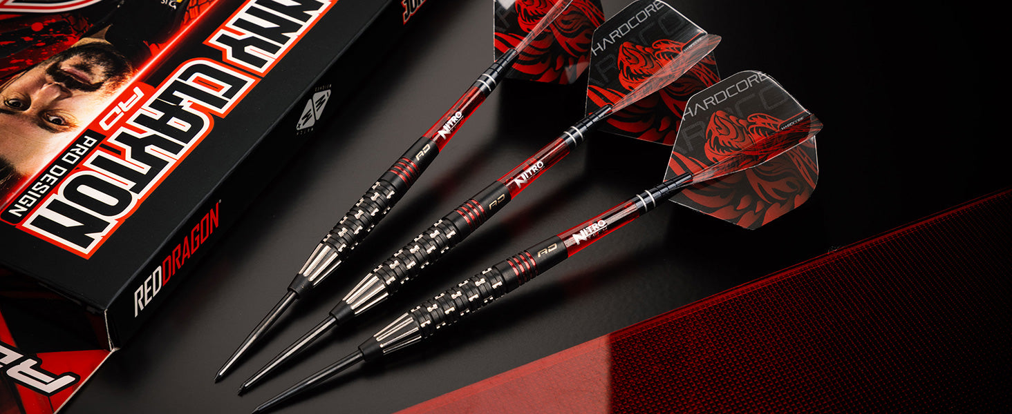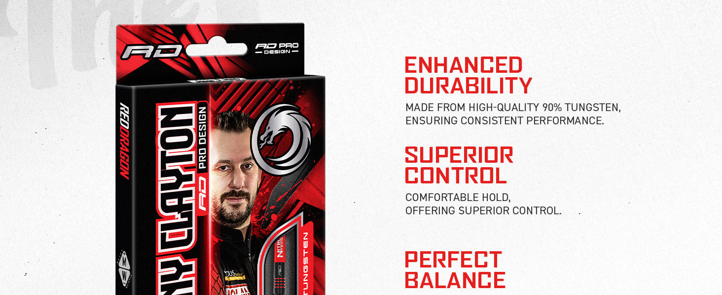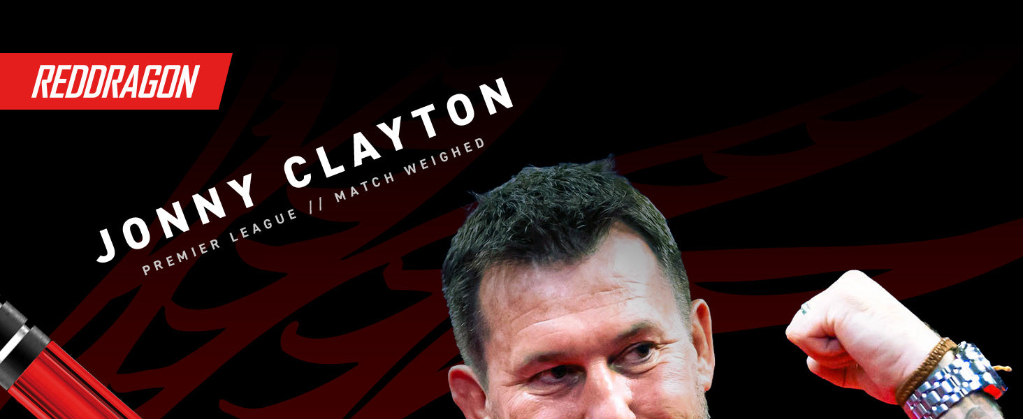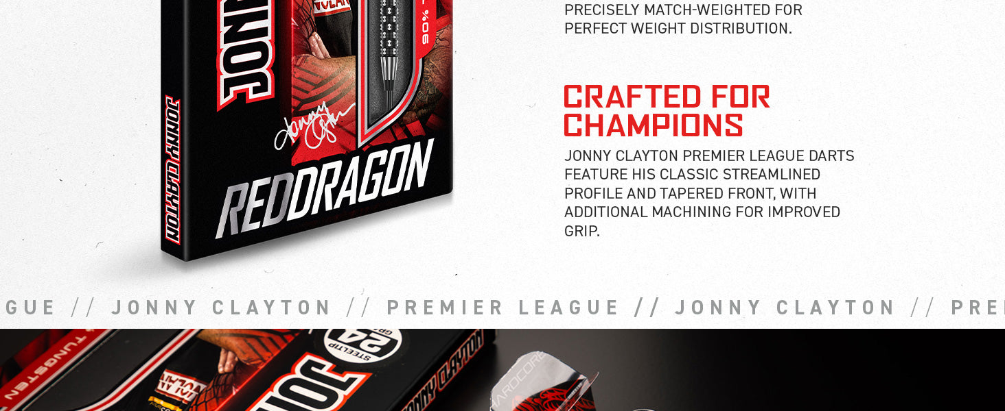 Jonny Clayton Special Edition Premier League darts, designed to celebrate the rapid rise of one of Wales’ greatest dart players after capturing the 2021 PDC Premier League Title. Jonny’s latest special edition darts feature his classic streamlined profile and tapered front, with additional machining for improved grip. The horizontal milled cuts around the nose are engineered to provide both style and front-end grip functionality. Along the parallel mid-section a double-machining process combines with Jonny’s classic double ringed machined pattern with milled cuts interspersed around the barrel for a subtle yet consistent feel, which were designed by Jonny himself to add an extra grip edge to his darts design. These stunning 90% tungsten darts are styled with a hardwearing, black Nitride coating and elegantly finished with metallic red rings.