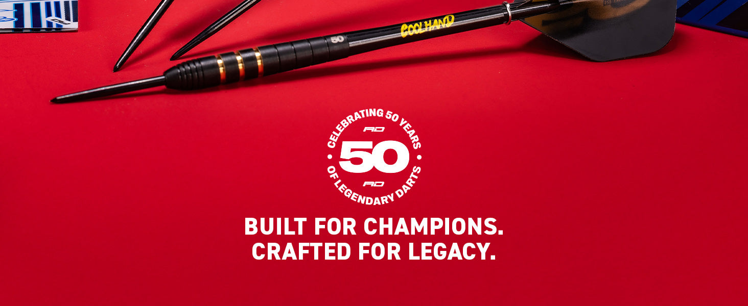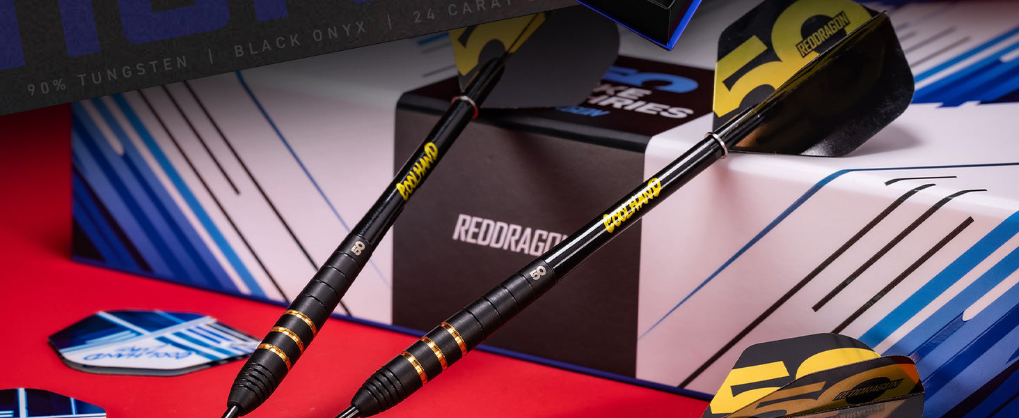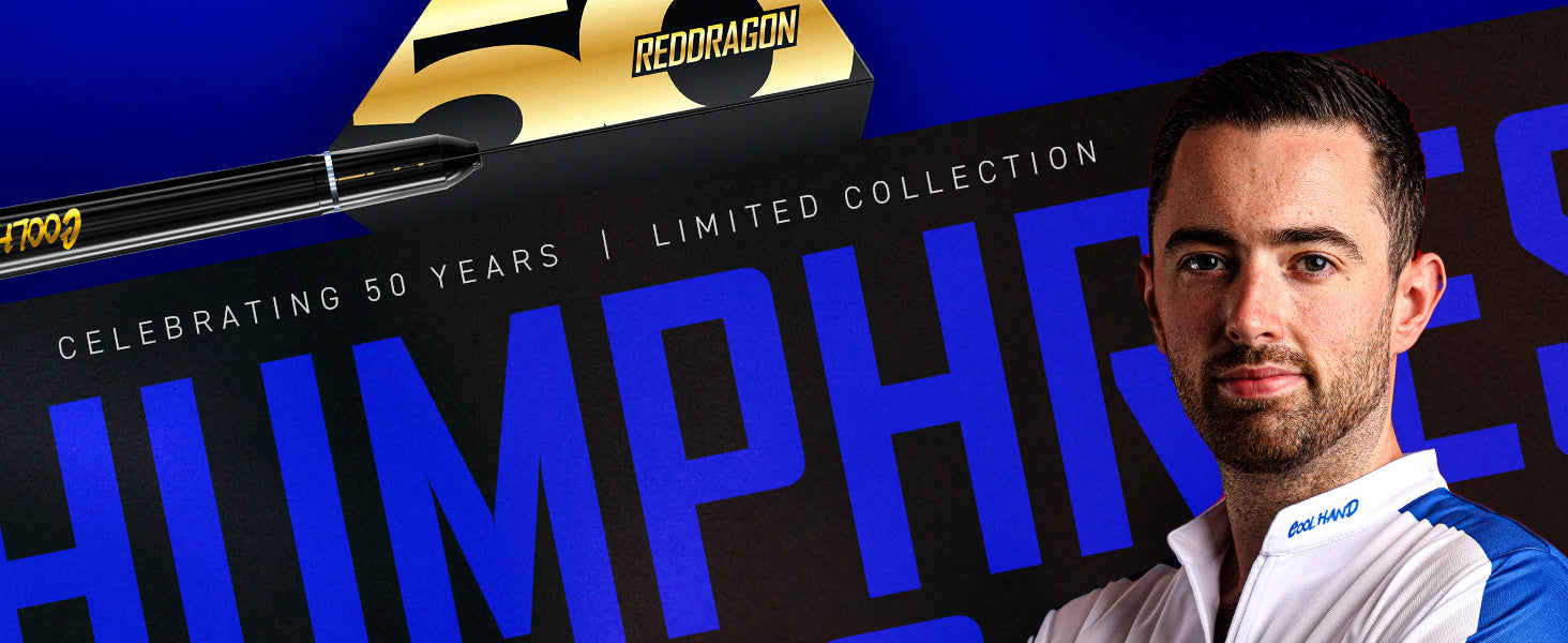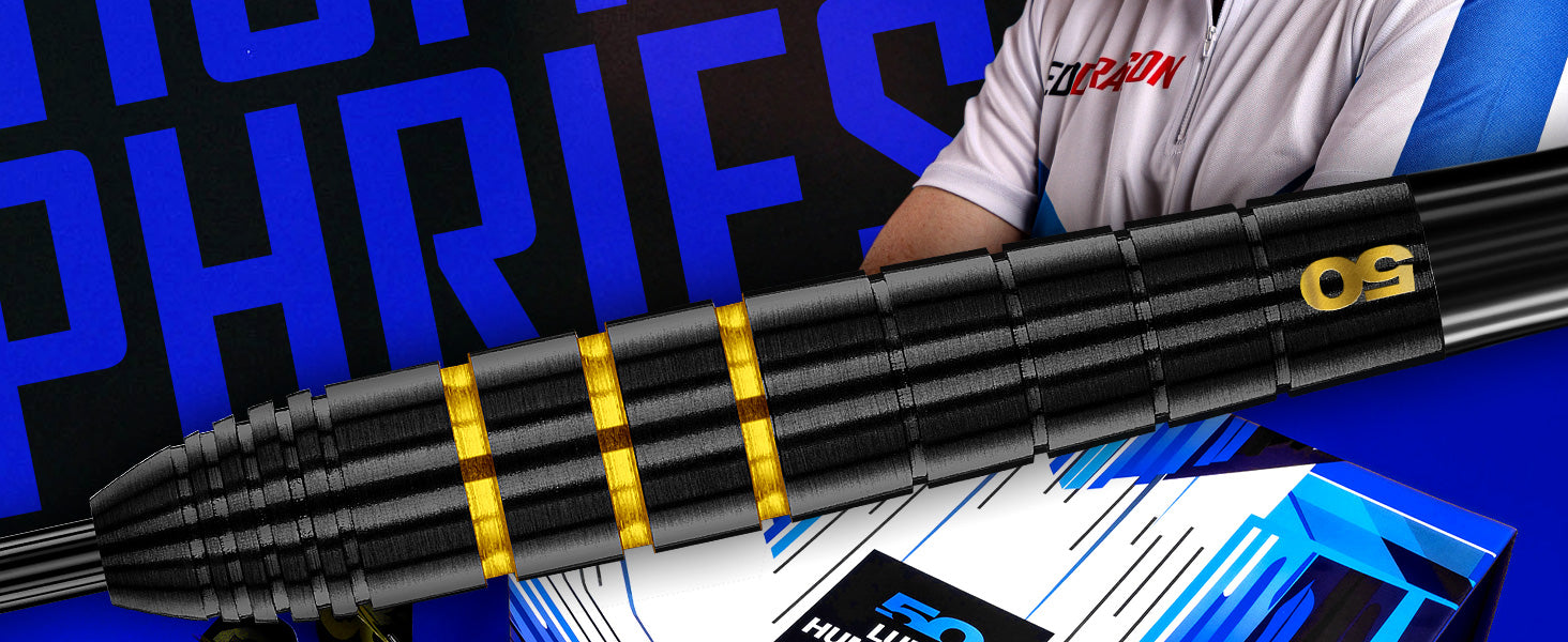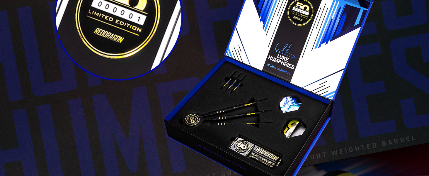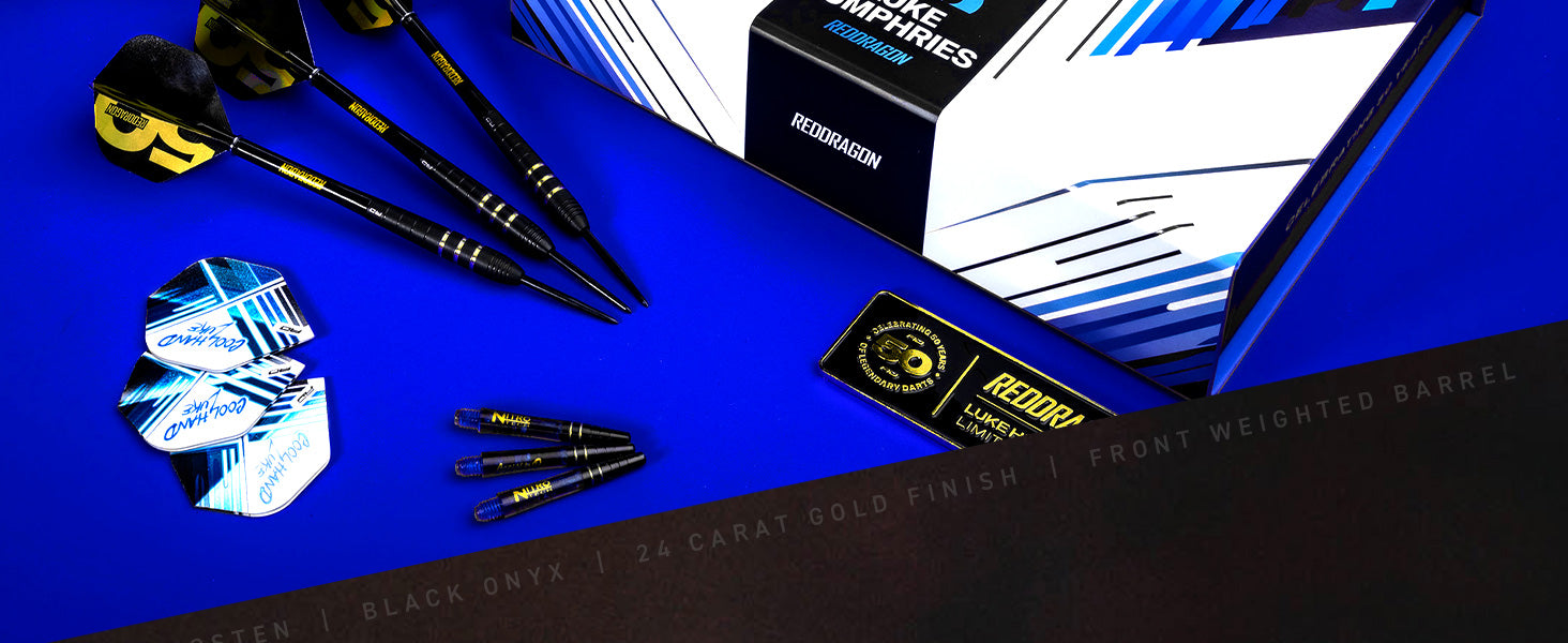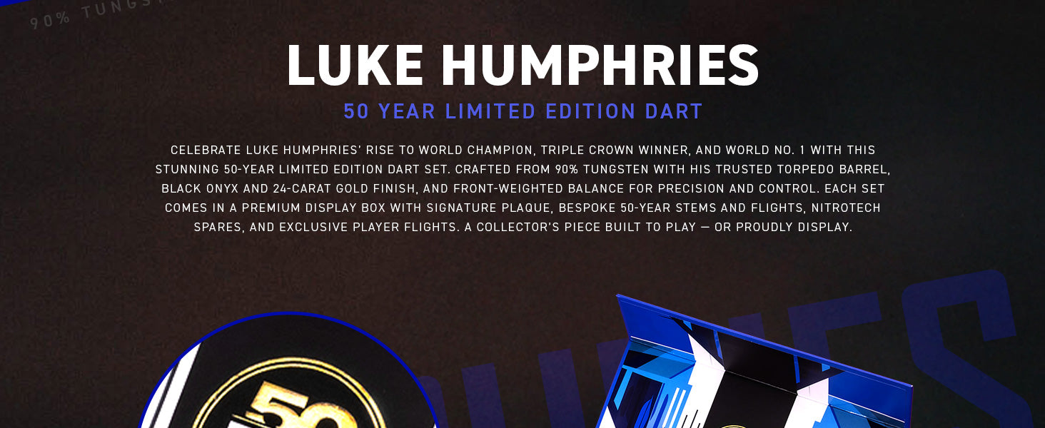 Luke Humphries – 50 Year Limited Edition Dart Luke Humphries has etched his name into modern darts with relentless precision. Now, the darts he used to define history as a World Champion, Triple Crown Champion and World Number 1, have been immortalised in this stunning 50-Year Limited Edition. It’s a tribute to his rise, delivered in a blend of black Onyx and 24-carat brilliance.