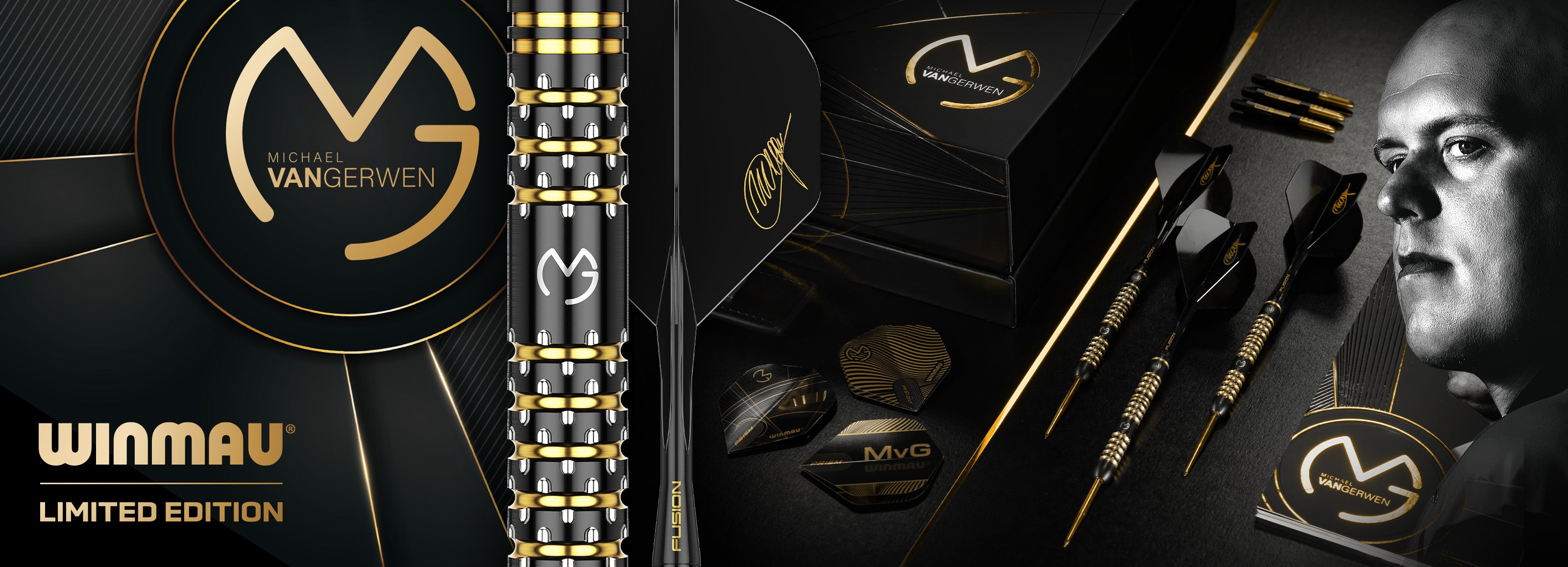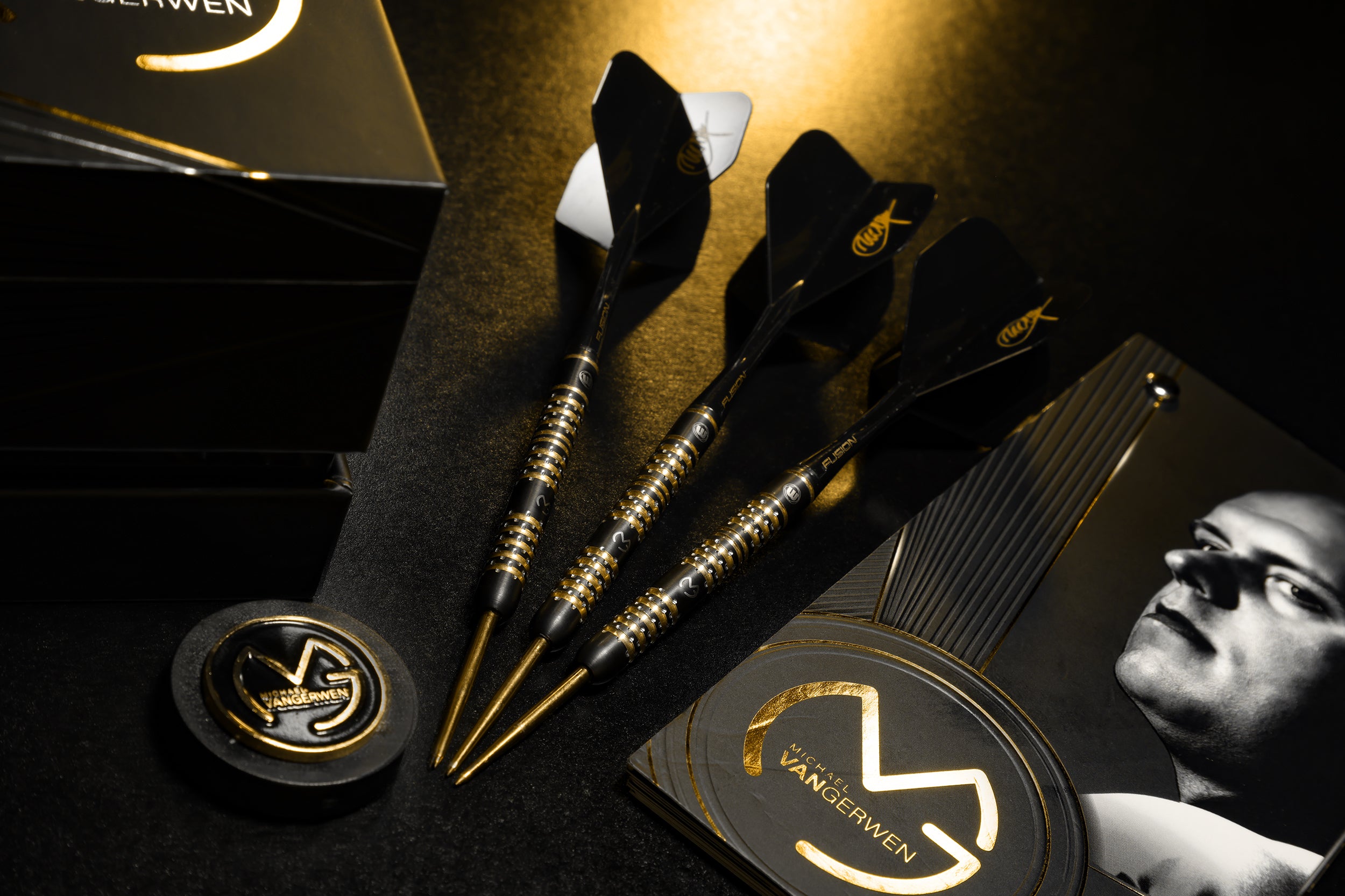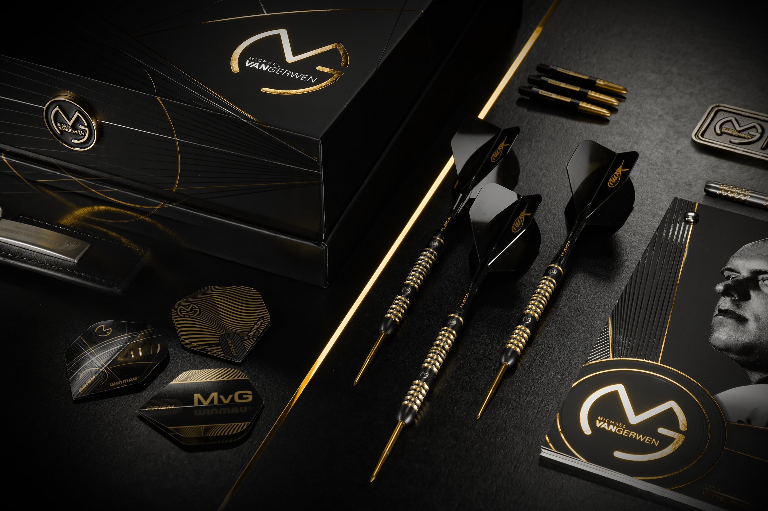 The premium collection includes two sets of specially designed MvG Black and Gold Vecta Stems, three limited edition MvG Pro Design Flights, and a distinctive MvG signature Black Fusion Integrated Flight and Shaft. Each set is authenticated by Michael's personal signature plaque, accompanied by a commemorative Anniversary Booklet and an exclusive MvG dart barrel key ring – creating an unrivaled package that celebrates half a decade of darting dominance.