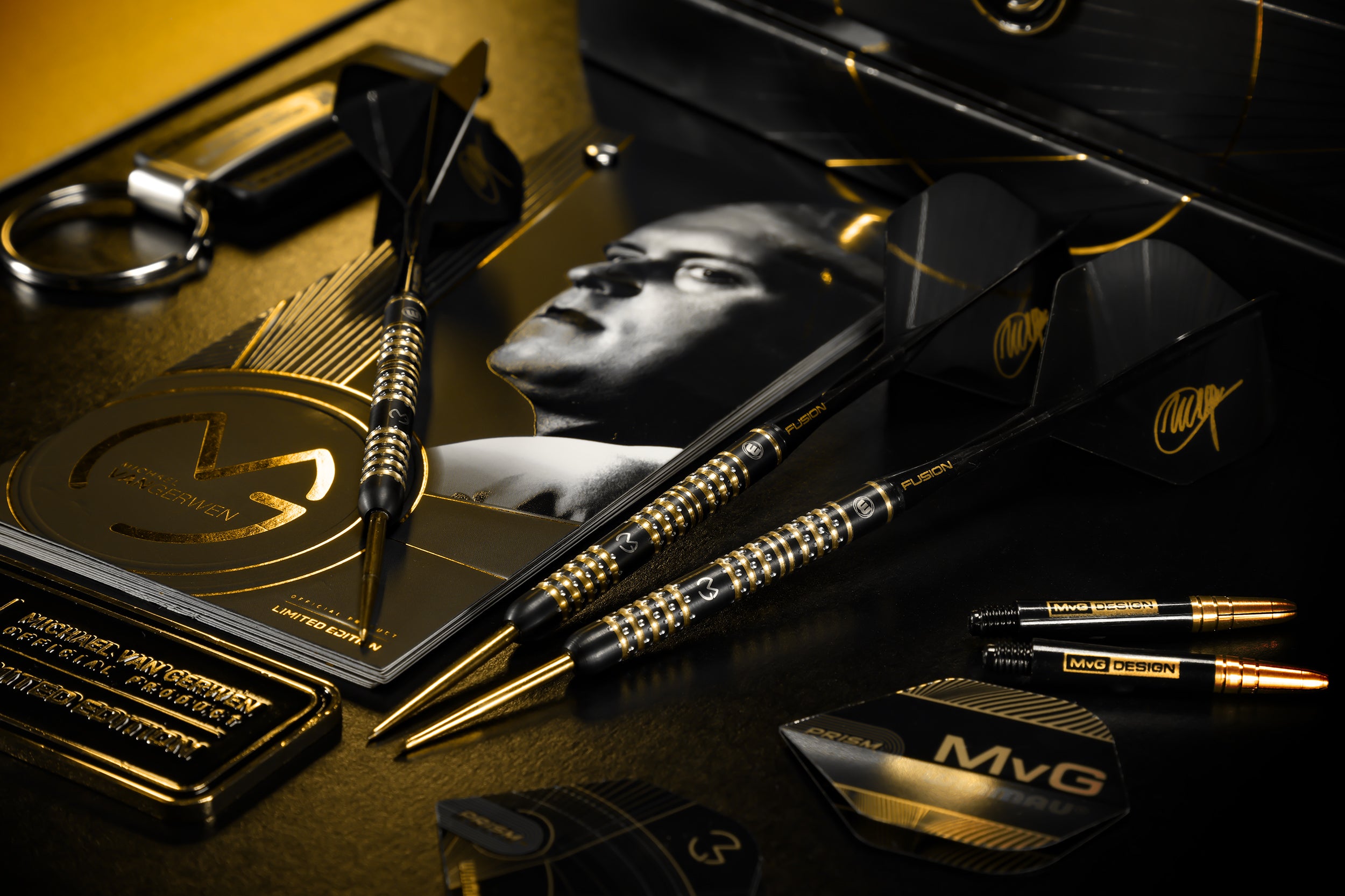 So you can truly make this Limited Edition dart your own, it is accompanied by an array of accessories which include two sets of limited edition MvG Black and Gold Vecta Stems, three limited edition MvG Pro Design Flights and a unique MvG signature Black Fusion Integrated Flight and Shaft. The gift box also includes an MvG Anniversary Booklet, an MvG signature plaque and a one of a kind, MvG dart barrel key ring.