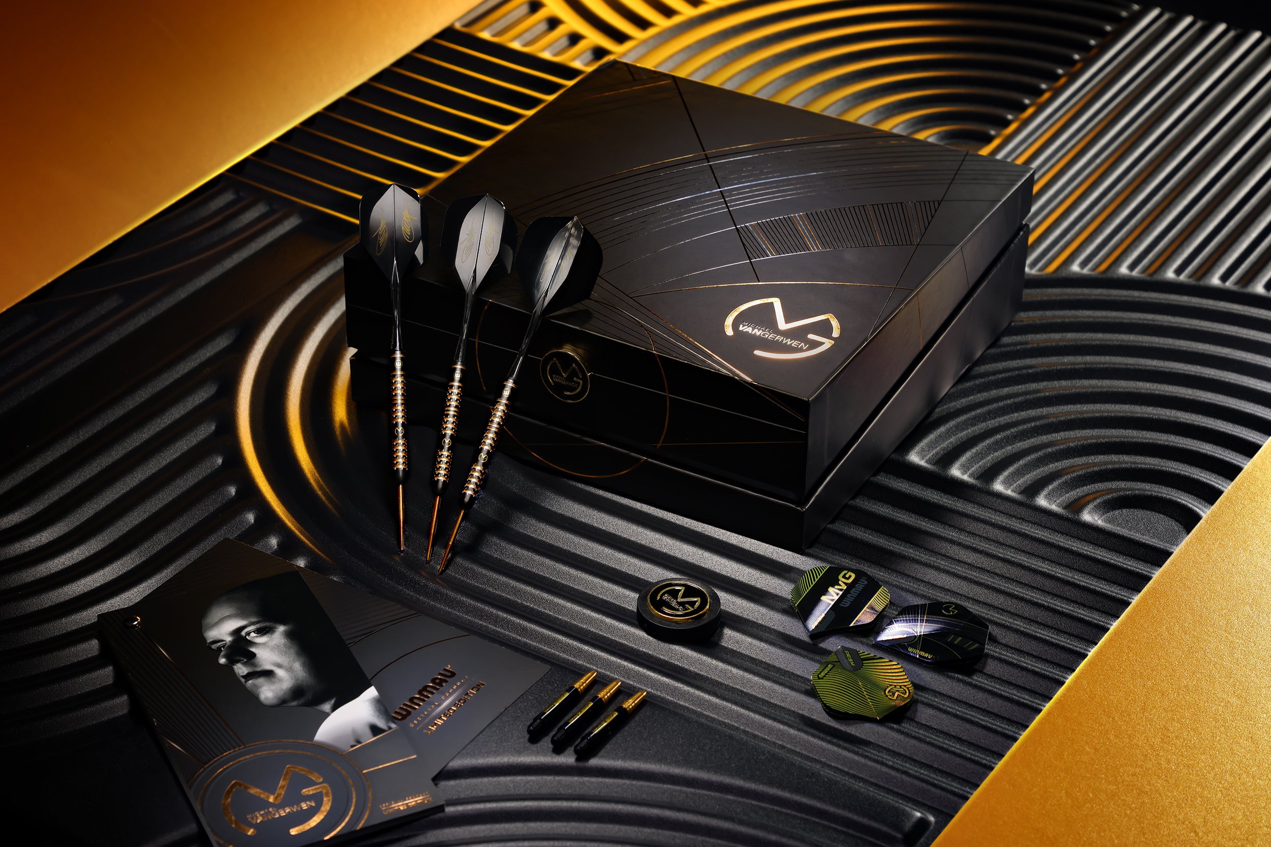 5 Year Anniversary Limited Edition Darts A collector’s dream, the Limited Edition MvG 5 Year Anniversary darts come in in a sleek and luxurious gift box. The 90% Tungsten darts take inspiration from Michael’s playing dart, delivering a 22.5g barrel which features the innovative Evo grip, milled over a black Onyx coating and finished with beautiful gold accents.