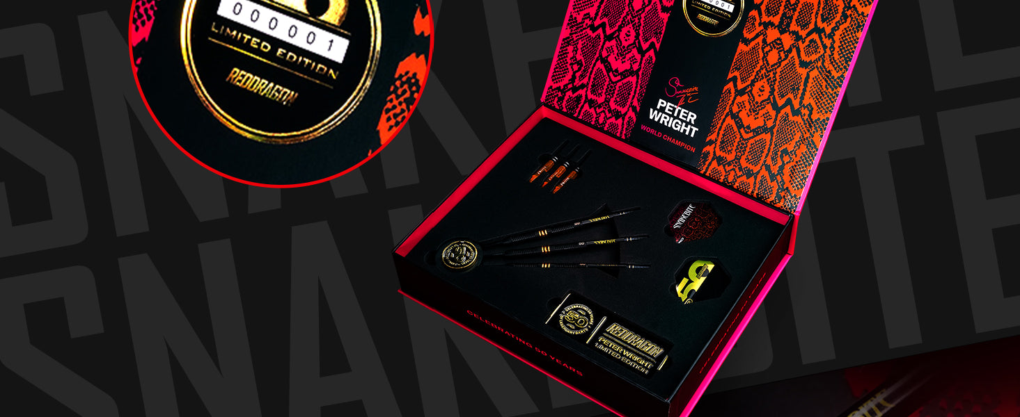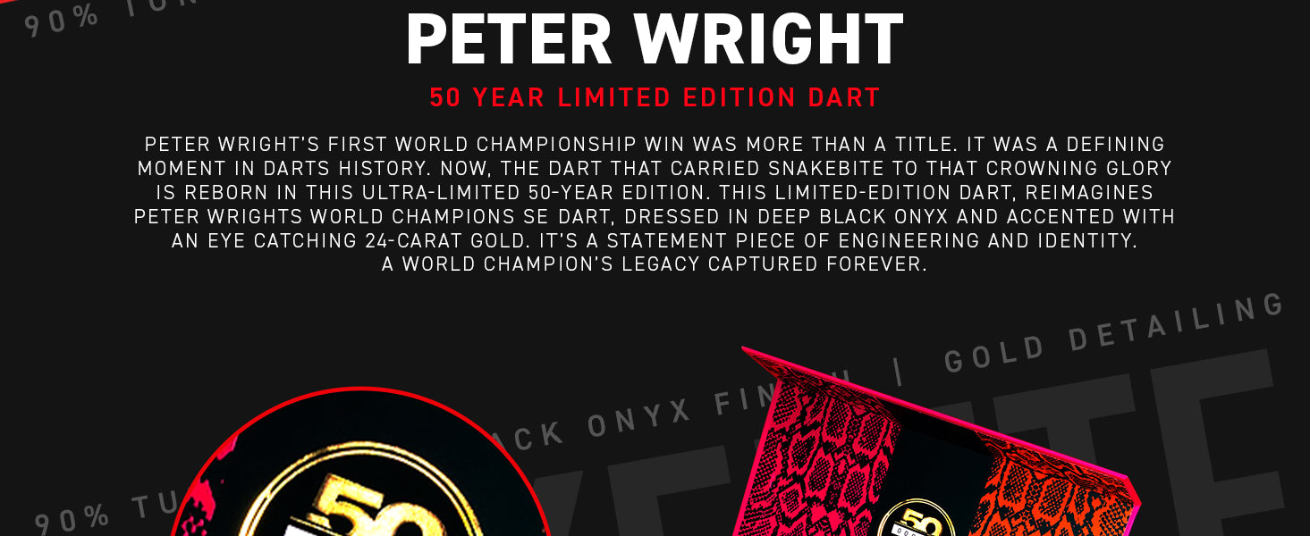 Peter Wright – 50 Year Limited Edition Dart Peter Wright’s first World Championship win was more than a title. It was a defining moment in darts history. Now, the dart that carried Snakebite to that crowning glory is reborn in this ultra-limited 50-Year Edition.