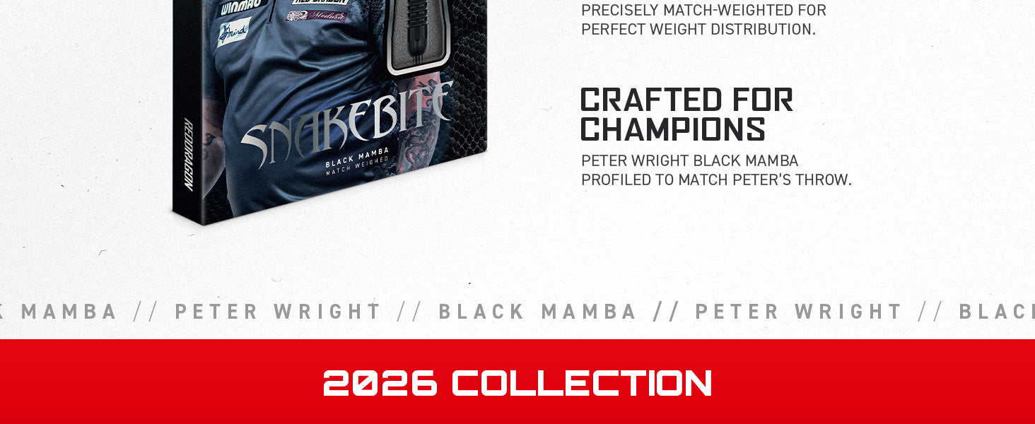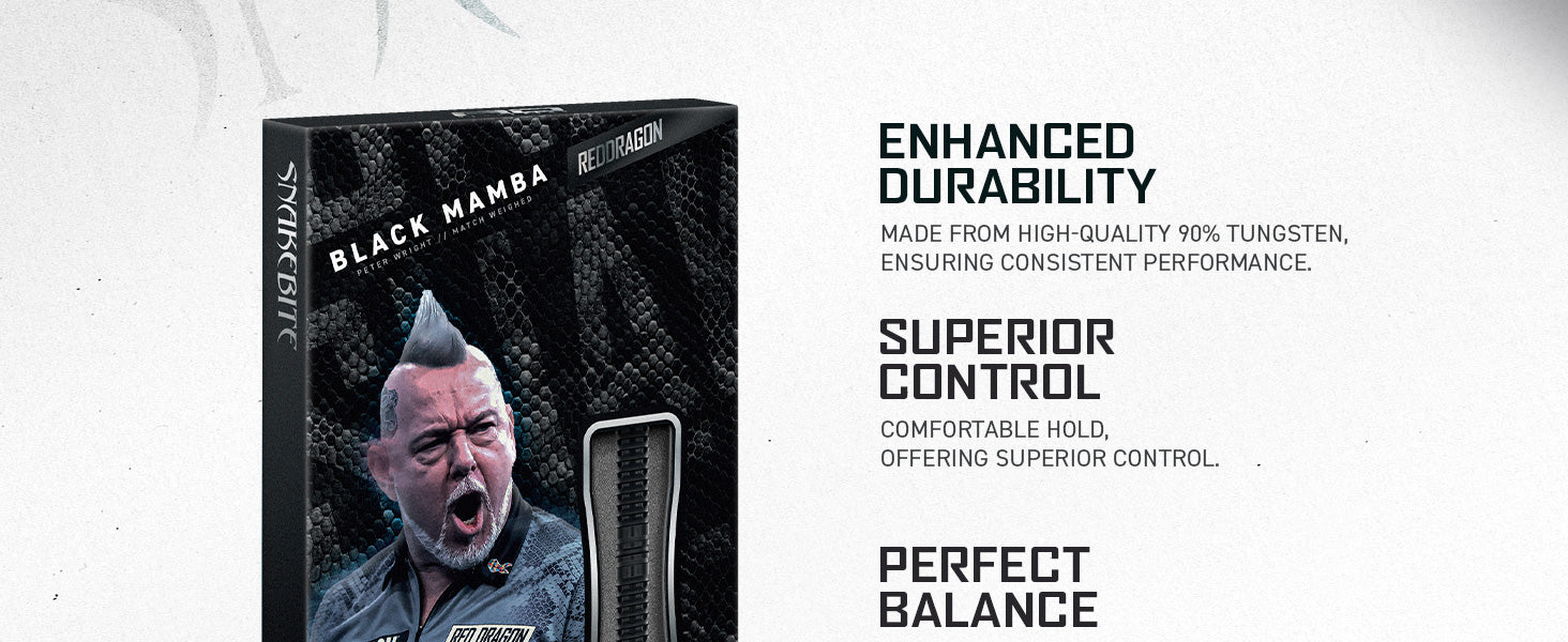Visually, the Black Mamba lives up to its name, a classic blacked-out barrel with a sleek, tour-inspire profile. Each dart is matched with signature Snakebite-designed flights, completing a bold, professional look that captures Peter Wright’s unique style and energy.