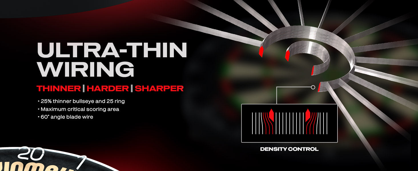 The ultra-thin 60° angled wire deflects darts into the scoring area for absolute minimal bounce outs.The fully hardened bullseye and outer bull, both featuring ‘Density Control™’ wire, are now 25% thinner.
