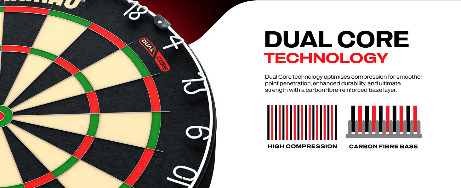 The patented Dual Core dartboard base offers a seamless, high visibility playing surface and optimised core density designed for maximum scoring.